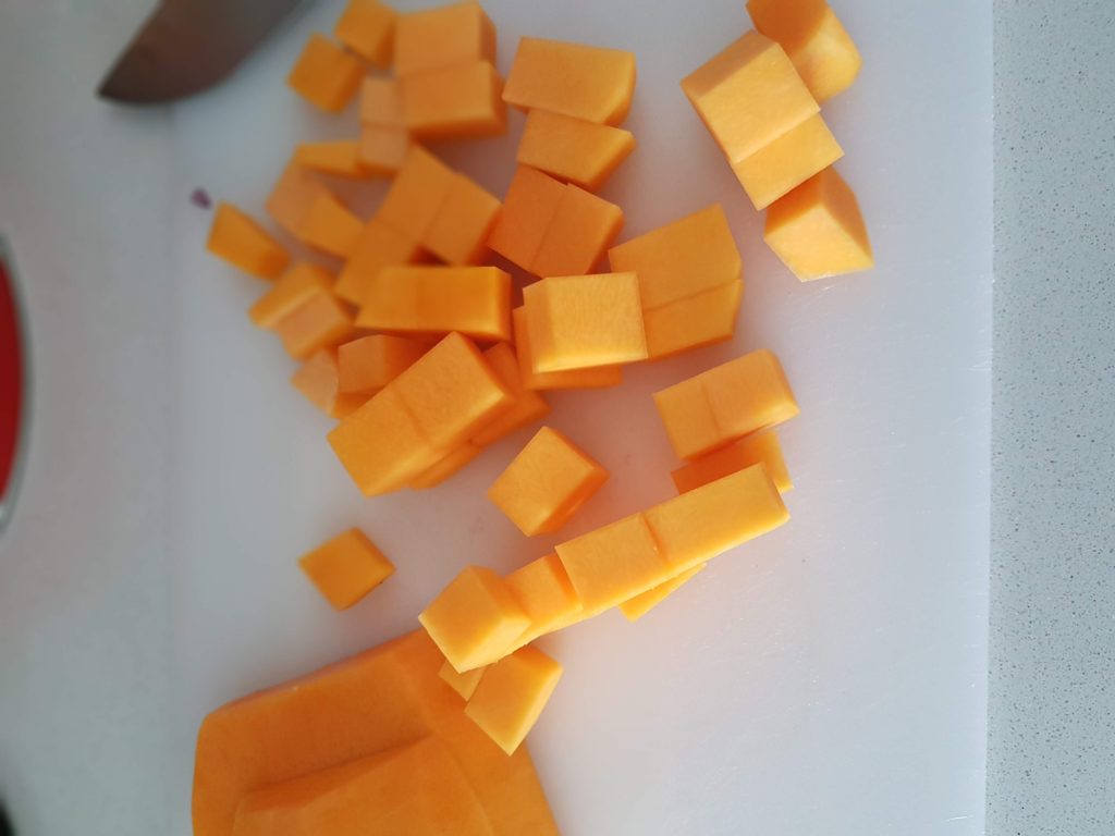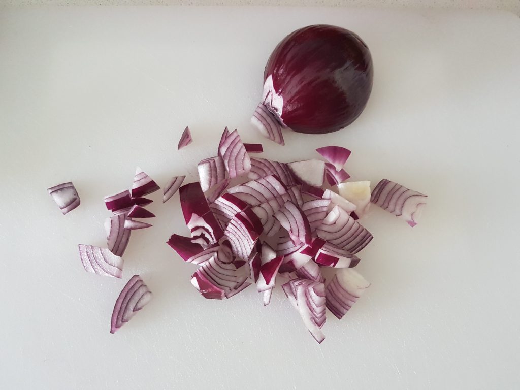 - Lavamos la berenjena y el tomate y los cortamos en trozos grandes (como de 3 centímetros). Lavamos también las espinacas y reservamos.