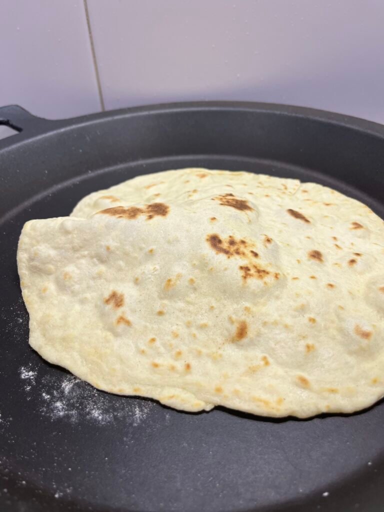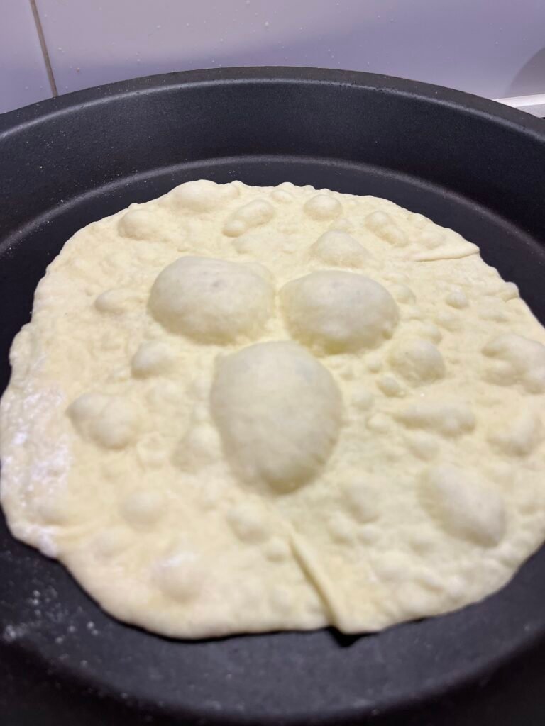 Calentamos una sartén a fuego fuerte y cocinamos los panes unos 5 minutos por cada lado. Veremos que se empiezan a inflar y le salen unas burbujas espectaculares. No os preocupéis si se tuestan de más, ese es el resultado.